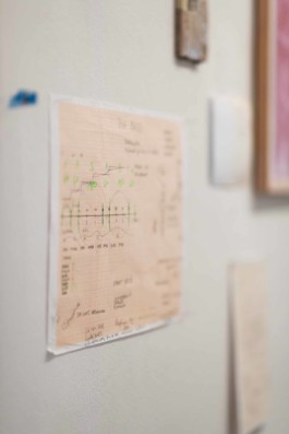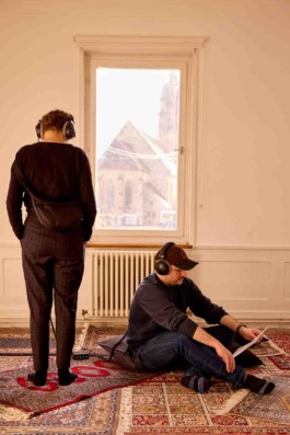 Hier oben sehen wir Ease, die neueste Arbeit in der Ausstellung. In dieser Arbeit begegnet man einer durch und durch künstlichen Landschaft. Ich sage man statt wir, weil ich wirklich nicht genau weiss, wer ich bin, wenn ich diesen Raum erlebe. Es ist eine ausserkörperliche Erfahrung. Hier hat der Klang einen direkten Bezug zum Raum, die Welt die man sieht ist in einem VR-Program entstanden und der Klang ist in dieser Welt räumlich verortet. Man bewegt sich also durch den Klang, und die kugelartigen Körper sind Anker für verschiedene Kompositionen.
